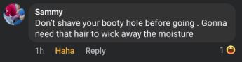 Sammy said: “Don’t shave your bootyhole before going. Gonna need that hair to wick away the moisture.”